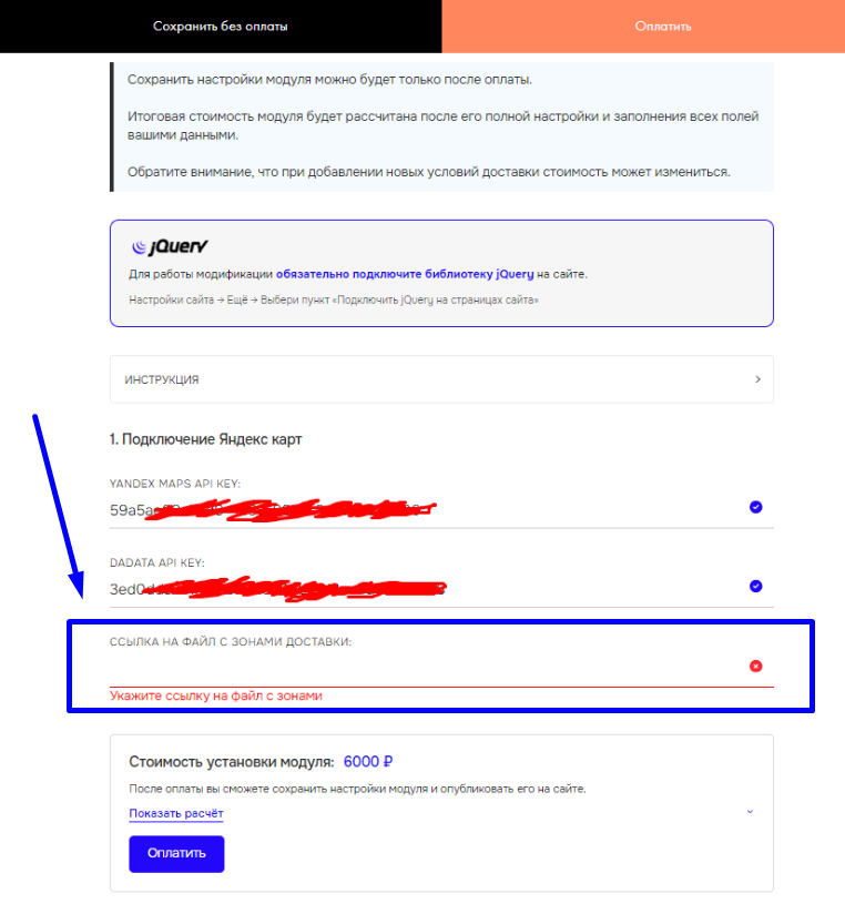 8) Полученную ссылку из шага 7 вставьте в поле модификации ССЫЛКА НА ФАЙЛ С ЗОНАМИ ДОСТАВКИ